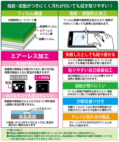 ・ 吸着面の特殊加工により貼付け後に気泡が分散される 為、小さなホコリや気泡が目立ちにくくなります。