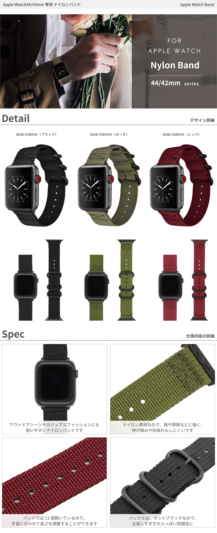 ・アウトドアシーンやカジュアルファッションにも使いやすい、Apple Watch44/42mm専用ナイロンバンドです。